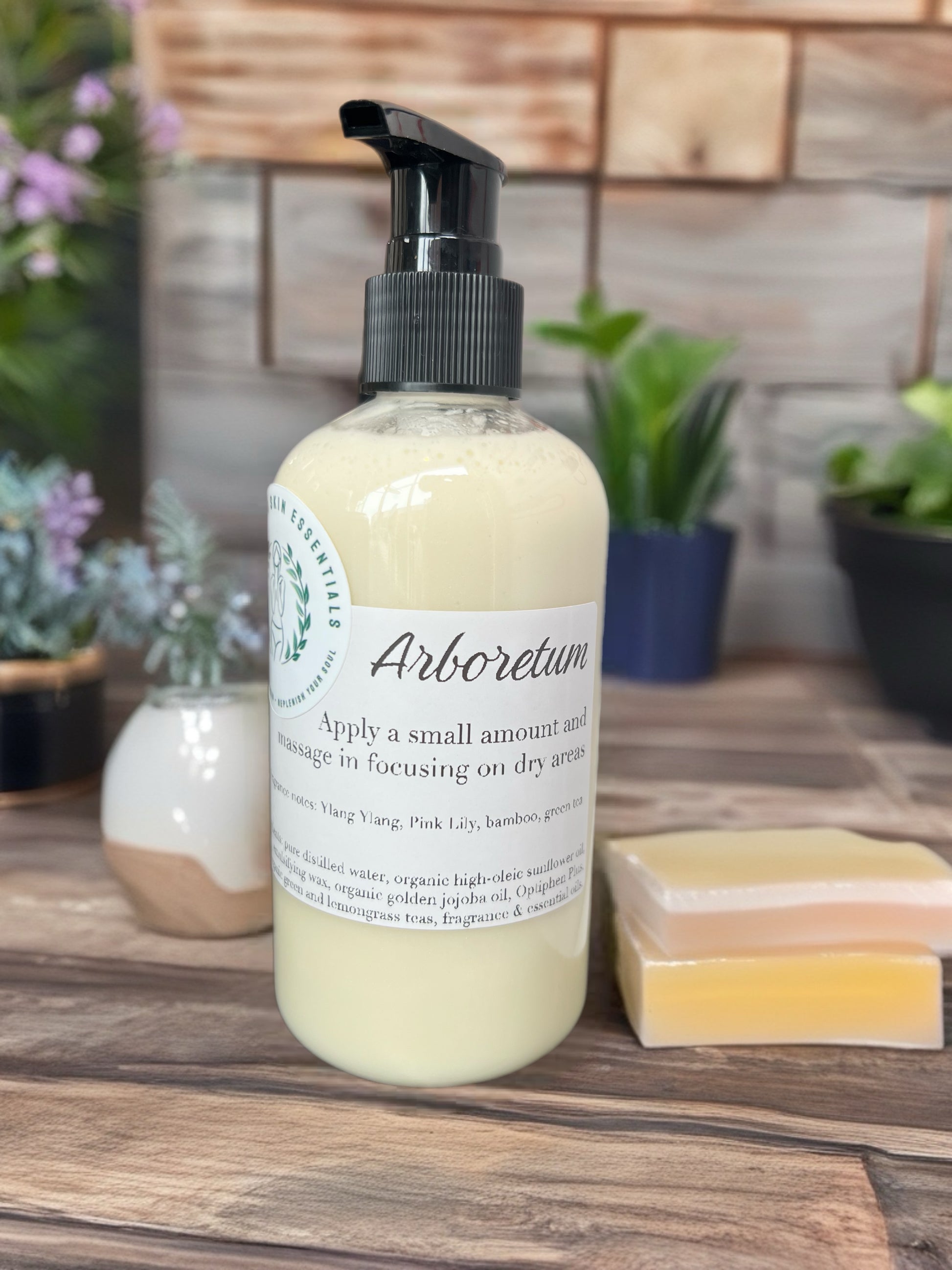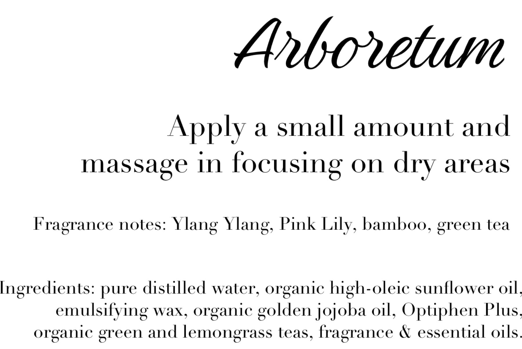 Formulated with organic sunflower and golden jojoba oils, this hydrating lotion melts effortlessly into the skin, delivering lasting nourishment while wrapping you in a clean, botanical fragrance. Infused with organic green and lemongrass teas, Arboretum is both soothing and refreshing—a gentle reminder of quiet walks beneath the trees.
